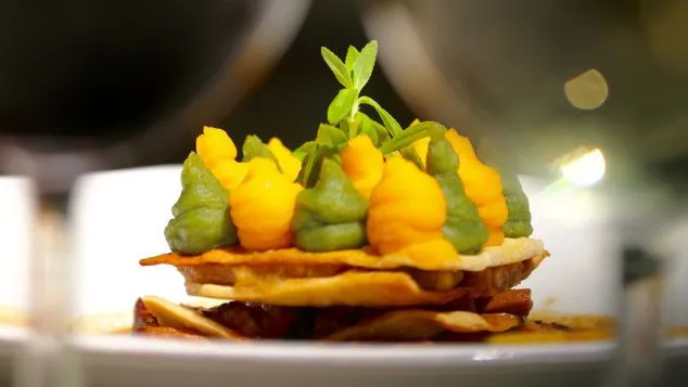 Khác với món thịt kho tàu thường xuất hiện trong các bữa ăn của người dân Việt Nam, tại Green Tangerin, thịt lợn nấu mềm với táo hầm, rau thơm, cà-rốt và khoai môn nghiền – được xếp lớp giữa các tấm bánh làm từ bột hạt sen giòn tan, theo phong cách bánh mille-feuille của Pháp.