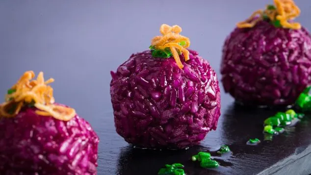 Lấy ví dụ như món ăn dân dã xôi gà, tại T-Art, xôi gà trở thành ba viên xôi xinh xắm có màu tím bóng bẩy, bên trong có nhân là thịt gà, nấm, đậu xanh…