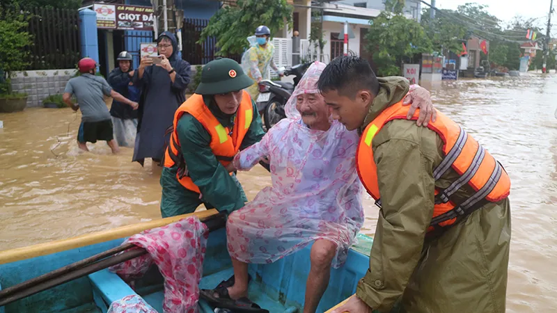 Lực lượng chức năng tham gia cứu hộ người dân bị ảnh hưởng bởi mưa lũ tại Quảng Trị. |