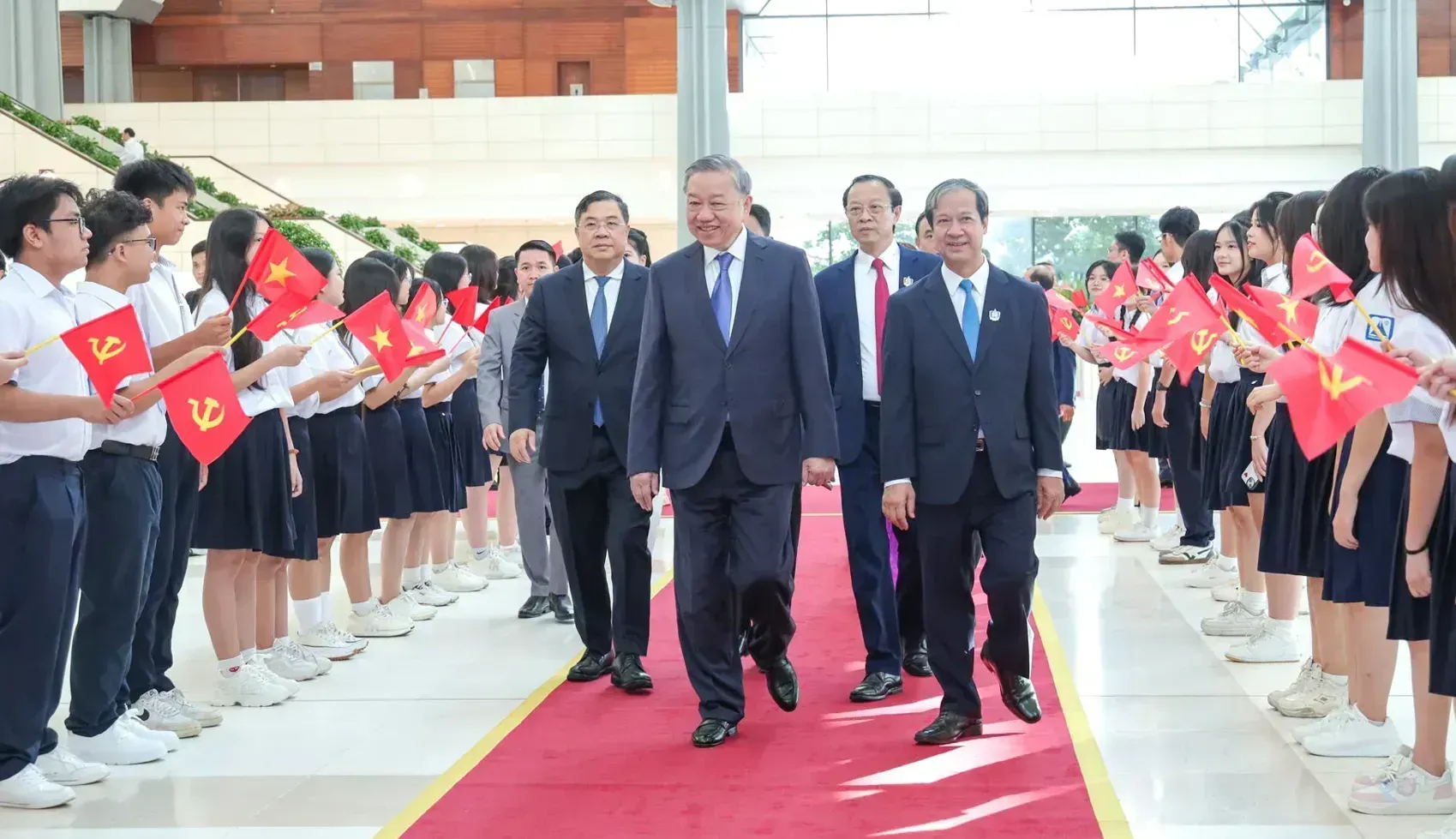 Tổng Bí thư Tô Lâm cùng các đại biểu tới dự khai giảng năm học 2025 – 2026 và kỷ niệm 80 năm truyền thống ngành giáo dục. Ảnh: VGP/Nhật Bắc