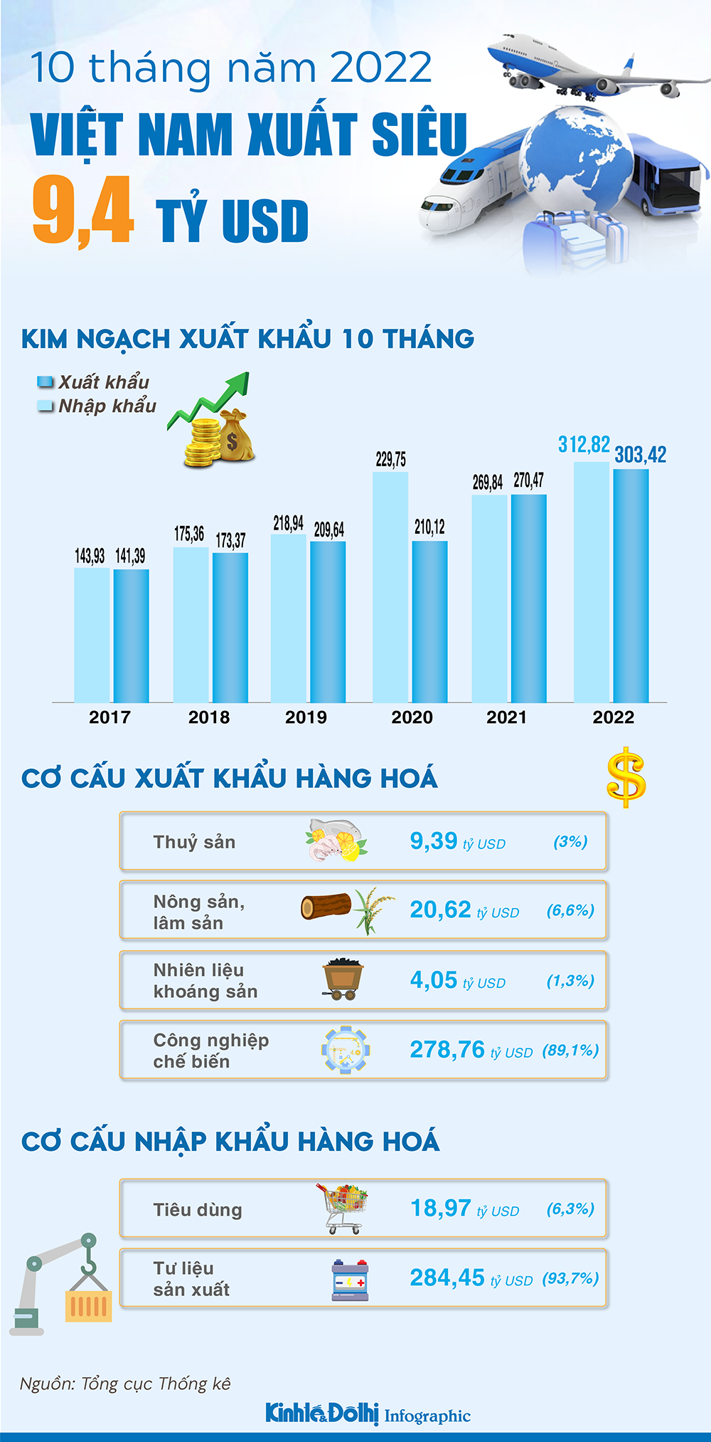 10 tháng năm 2022, cả nước xuất siêu 9,4 tỷ USD