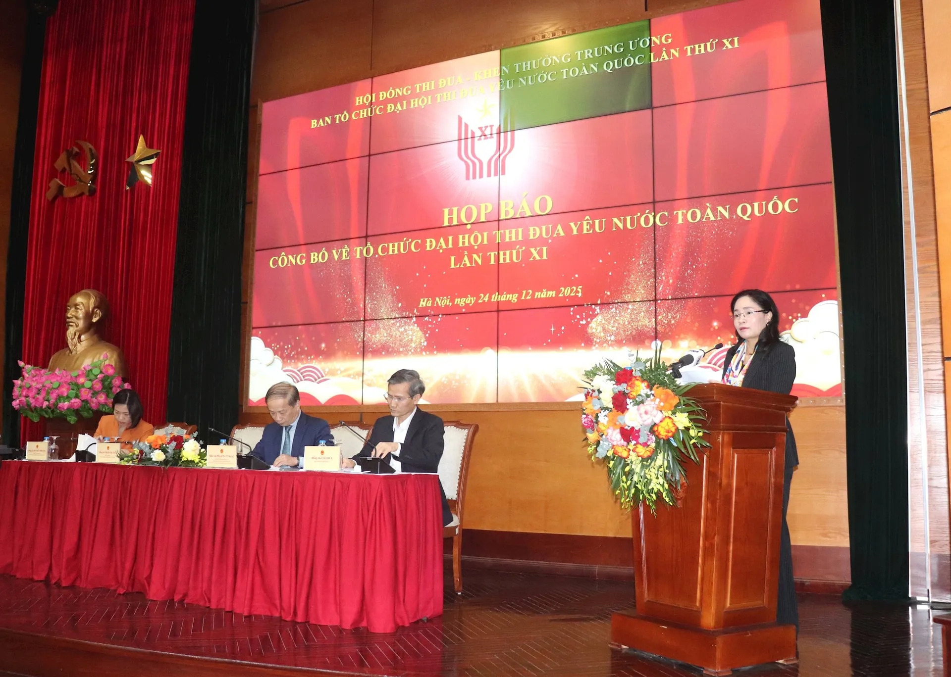 Thông tin về công tác tổ chức Đại hội Thi đua yêu nước toàn quốc lần thứ XI, Phó Trưởng ban Thi đua - Khen thưởng T.Ư Đỗ Thúy Phượng cho biết, Đại hội Thi đua yêu nước toàn quốc lần thứ XI có chủ đề “Thi đua đổi mới, sáng tạo, tăng tốc bứt phá đưa đất nước vào kỷ nguyên phát triển hùng cường, văn minh, thịnh vượng”, sẽ diễn ra trong hai ngày 26-27/12/2025, tại Trung tâm Hội nghị quốc gia (Hà Nội).