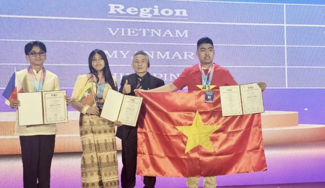 Em Đoàn Tuấn Nghĩa (cầm cờ), lớp 7G, Trường THCS Võ Thị Sáu nhận Huy chương Đồng Olympic toán học thế giới WIMO 2025 tại Hồng Kông, Trung Quốc. Ảnh: cơ sở cung cấp