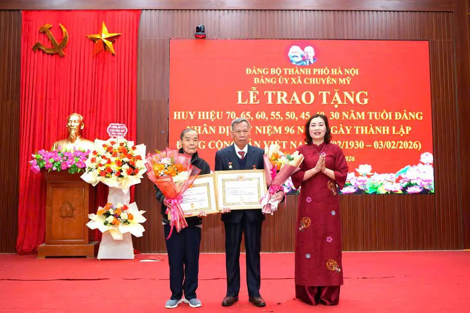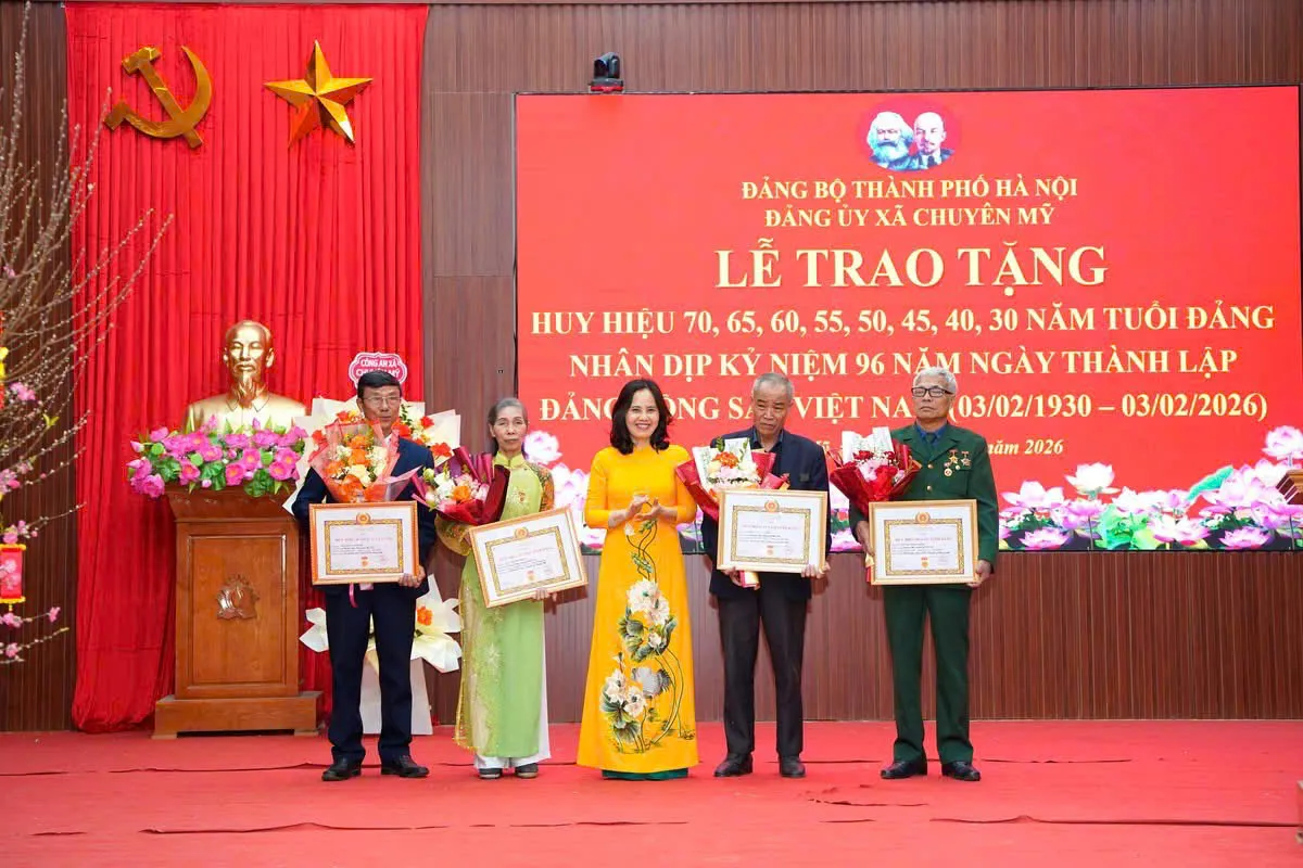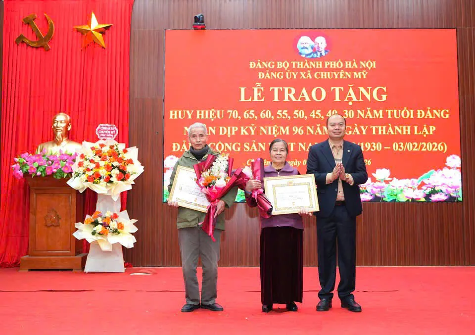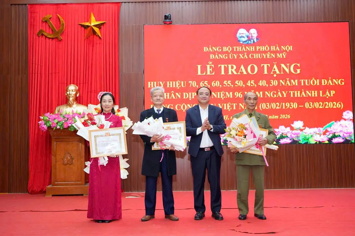 Kinhtedothi - Ngày 3/2, đúng dịp kỷ niệm 96 năm ngày thành lập Đảng Cộng sản Việt Nam (3/2/1930 - 3/2/2026), Đảng ủy xã Chuyên Mỹ tổ chức Lễ trao Huy hiệu 70, 65, 60, 55, 50, 45, 40 và 30 năm tuổi Đảng cho các đảng viên cao tuổi Đảng.