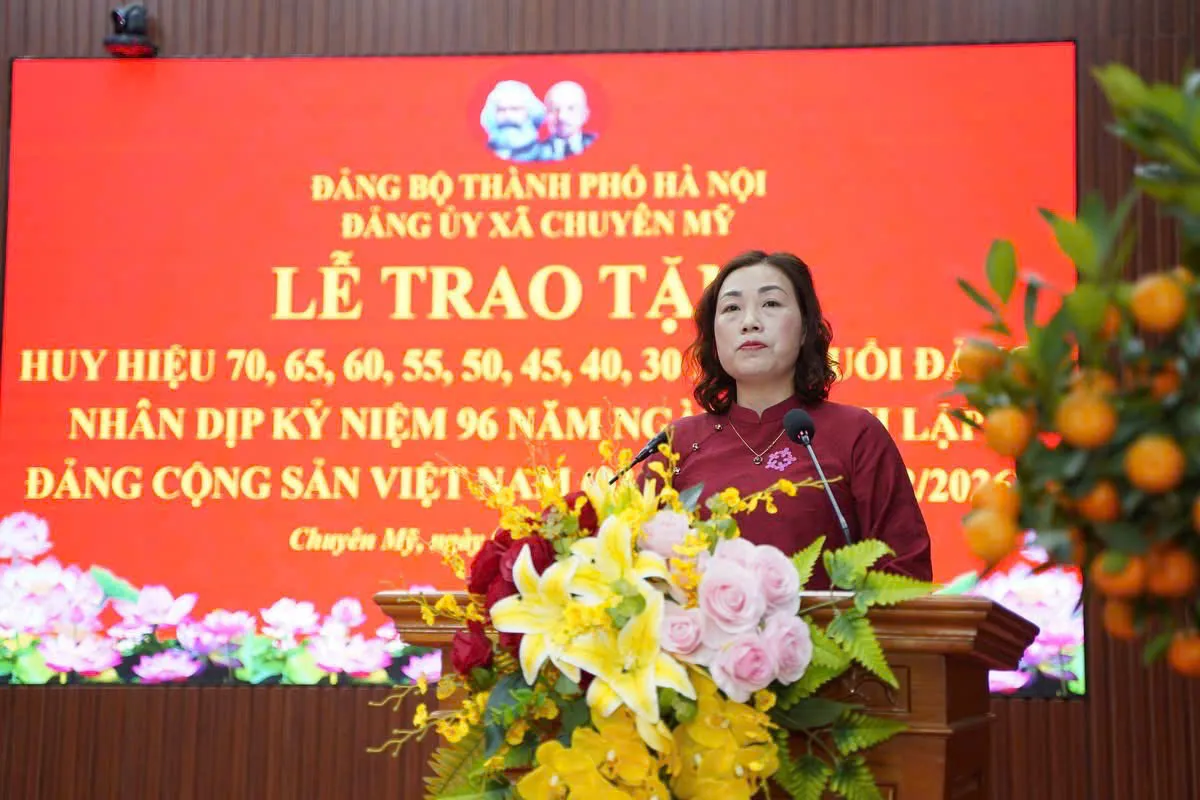 Phát biểu tại buổi lễ, Phó Bí thư Thường trực Đảng uỷ xã Chuyên Mỹ Trần Thị Dung chúc mừng các đảng viên vinh dự được trao tặng Huy hiệu Đảng, đồng thời khẳng định Huy hiệu Đảng là niềm vinh dự, tự hào không chỉ của mỗi cá nhân đảng viên và gia đình, mà còn là niềm tự hào chung của Đảng bộ và Nhân dân xã.