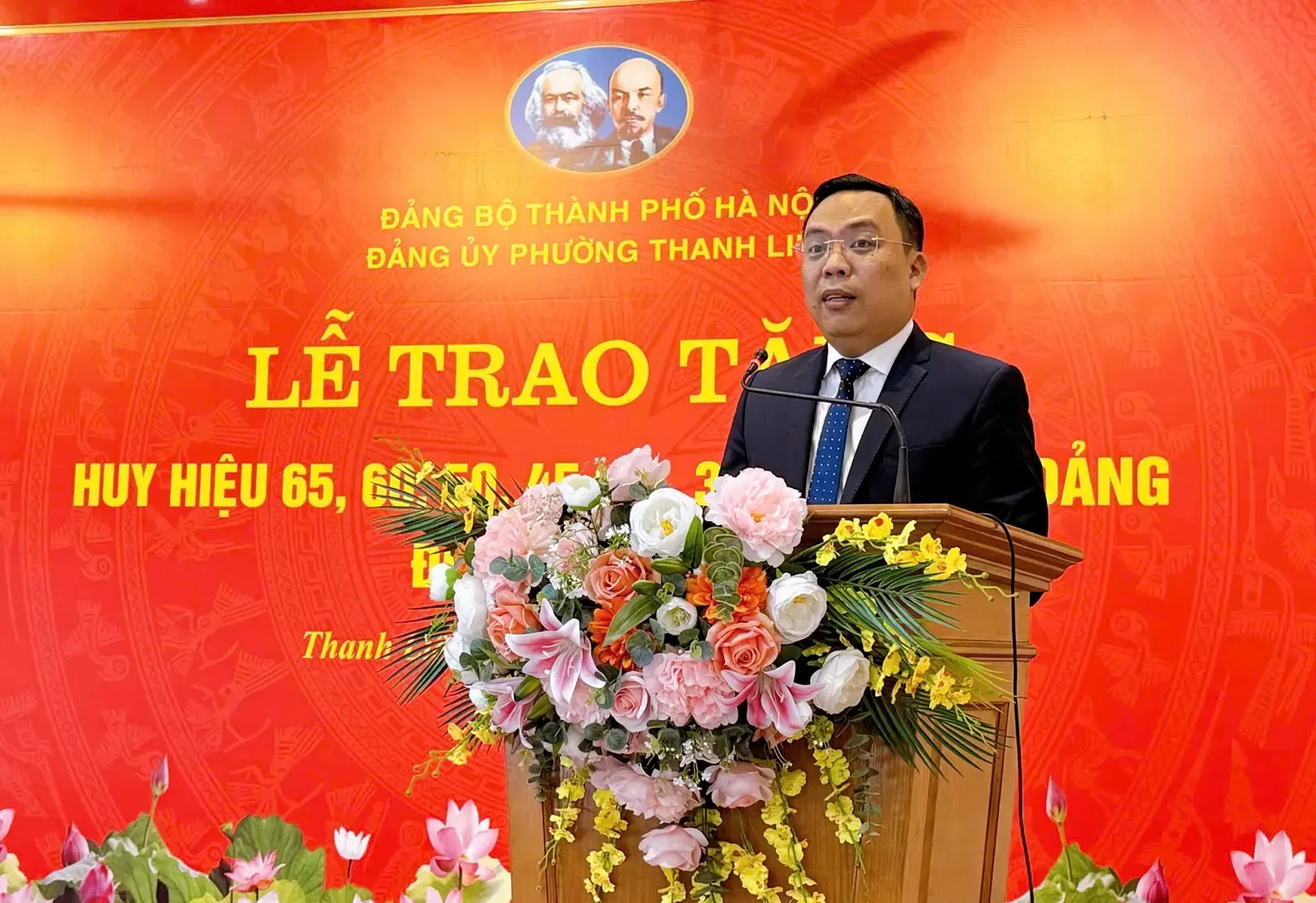 Phó Bí thư Thường trực Đảng ủy phường Thanh Liệt Lý Duy Xuân trao Huy hiệu Đảng cho các đảng viên.