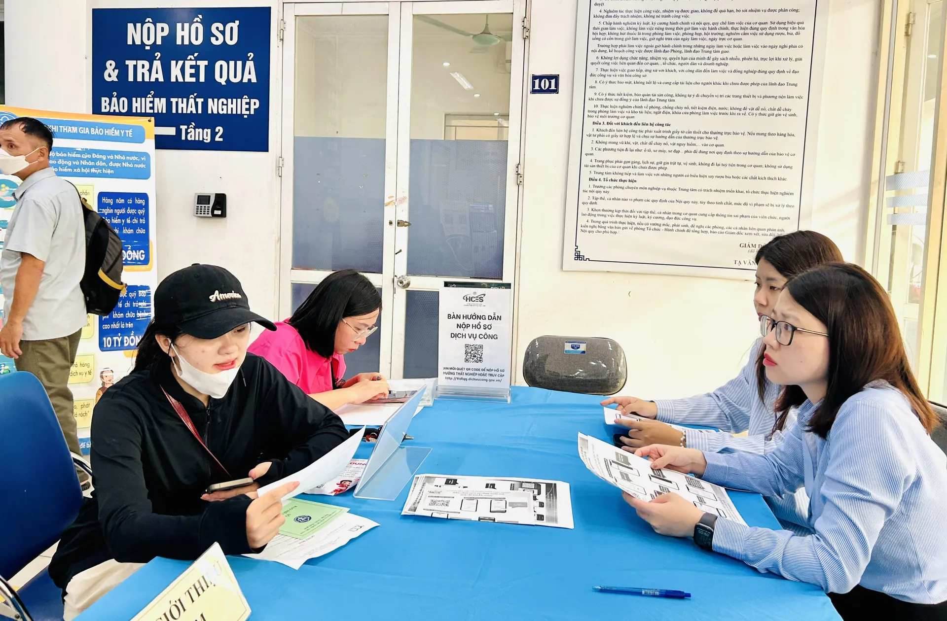 Người lao động được hướng dẫn làm thủ tục hưởng chính sách bảo hiểm thất nghiệp tại Sàn giao dịch việc làm Hà Nội. Ảnh: Trần Oanh