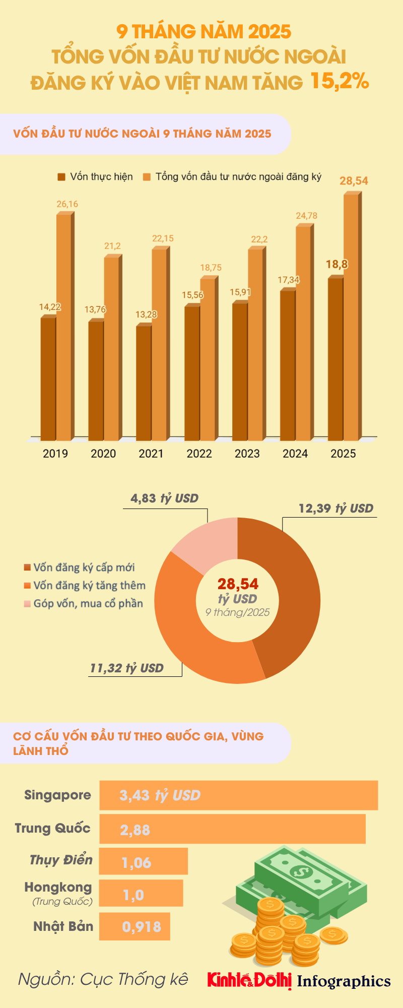 9 tháng năm 2025: vốn đầu tư nước ngoài đăng ký vào Việt Nam tăng 15,2%