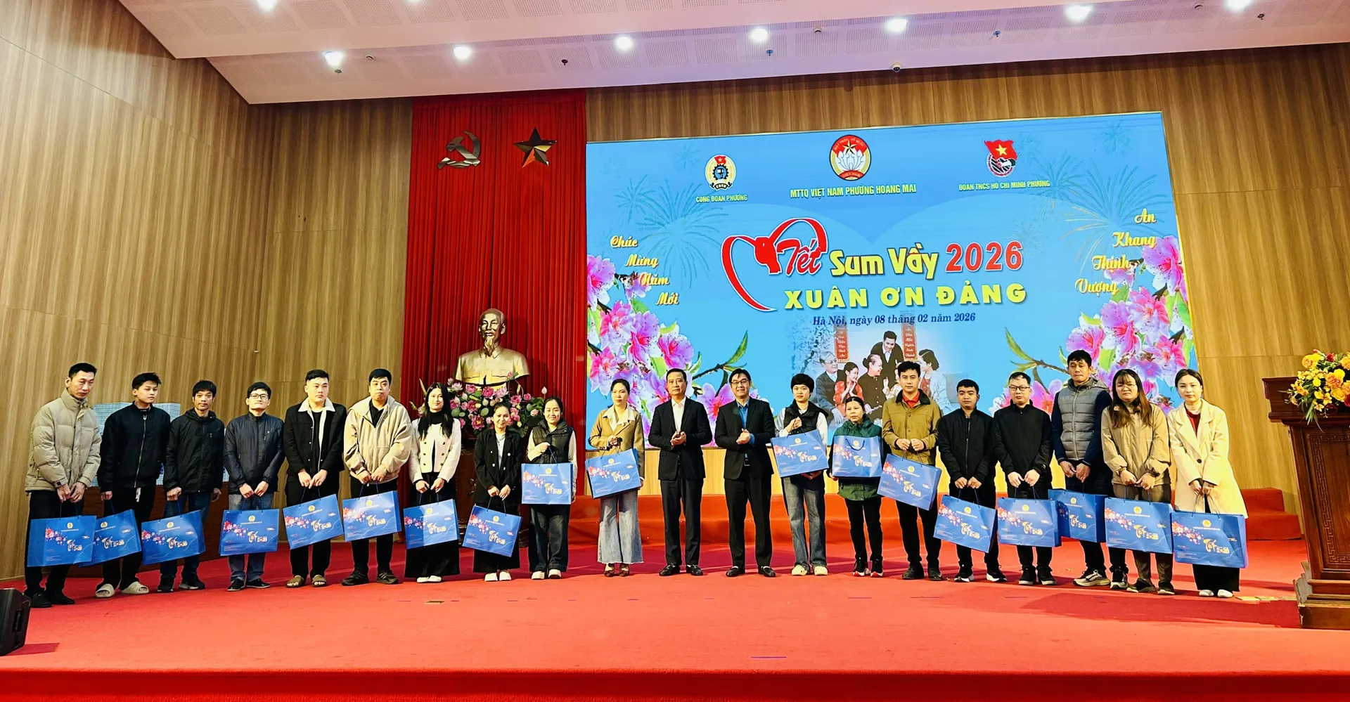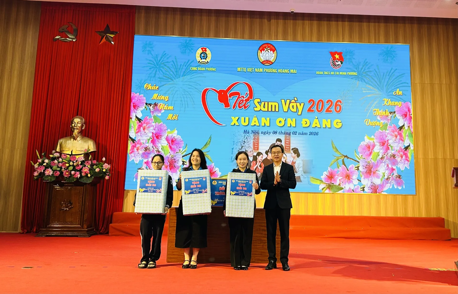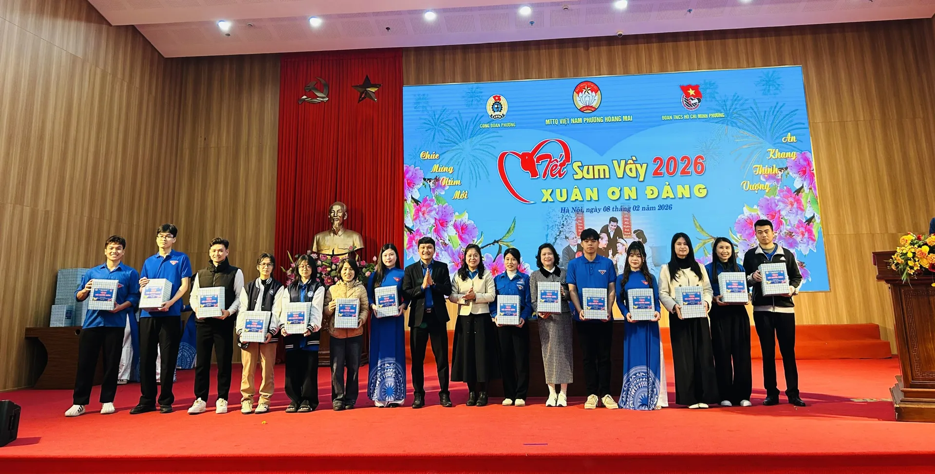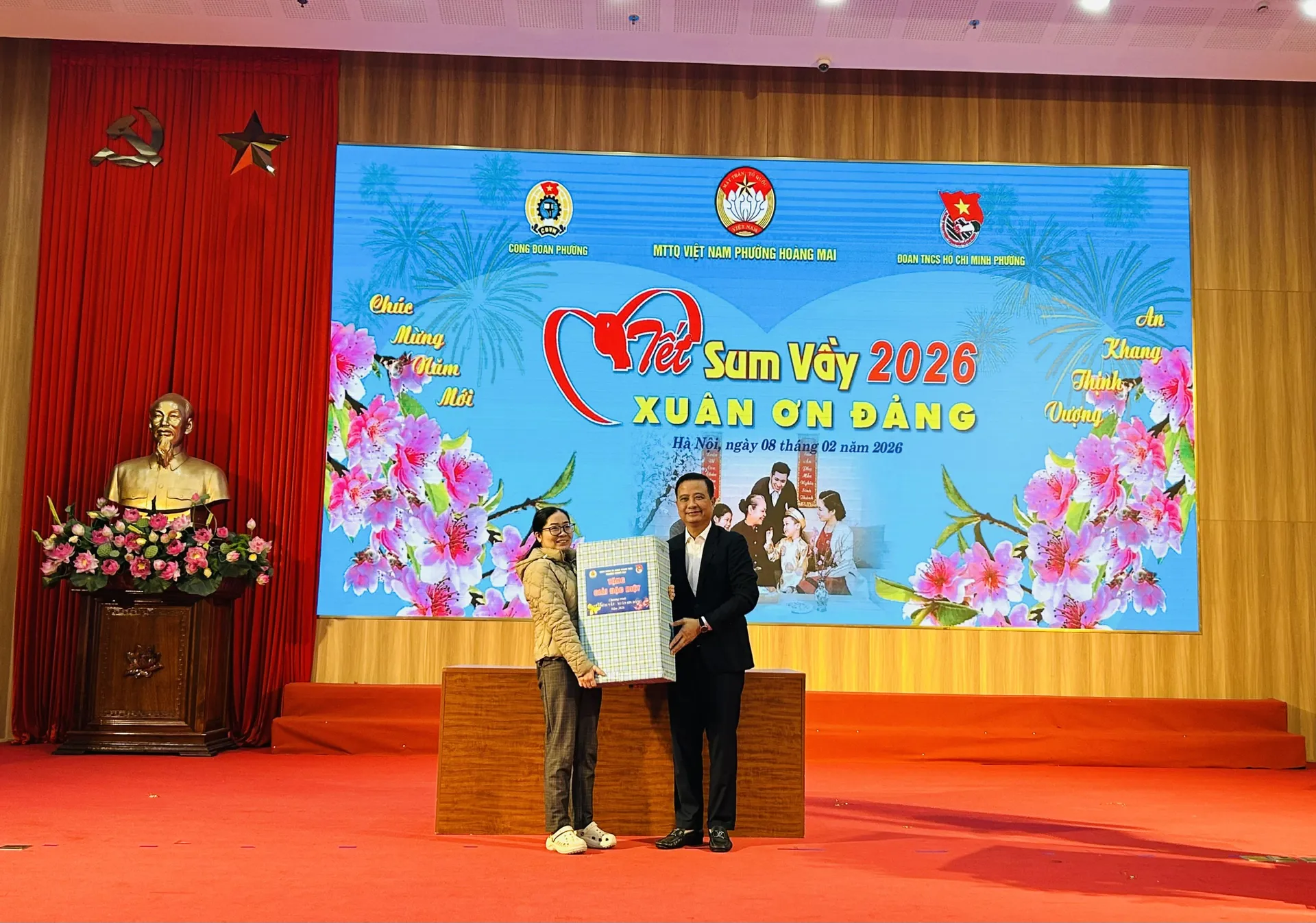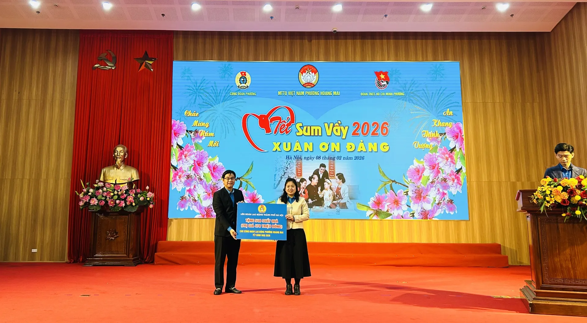 Tại chương trình “Tết sum vầy - Xuân ơn Đảng” 2026, công đoàn phường Hoàng Mai và Đoàn Thanh niên phối hợp tặng quà cho 50 đoàn viên công đoàn và 50 đoàn viên thanh thiếu nhi có hoàn cảnh khó khăn với sự hỗ trợ của Ngân hàng Agribank chi nhánh Tam Trinh, Công ty Toyota Pháp Vân, Câu lạc bộ Gia đình - Trí tuệ - Tình người.