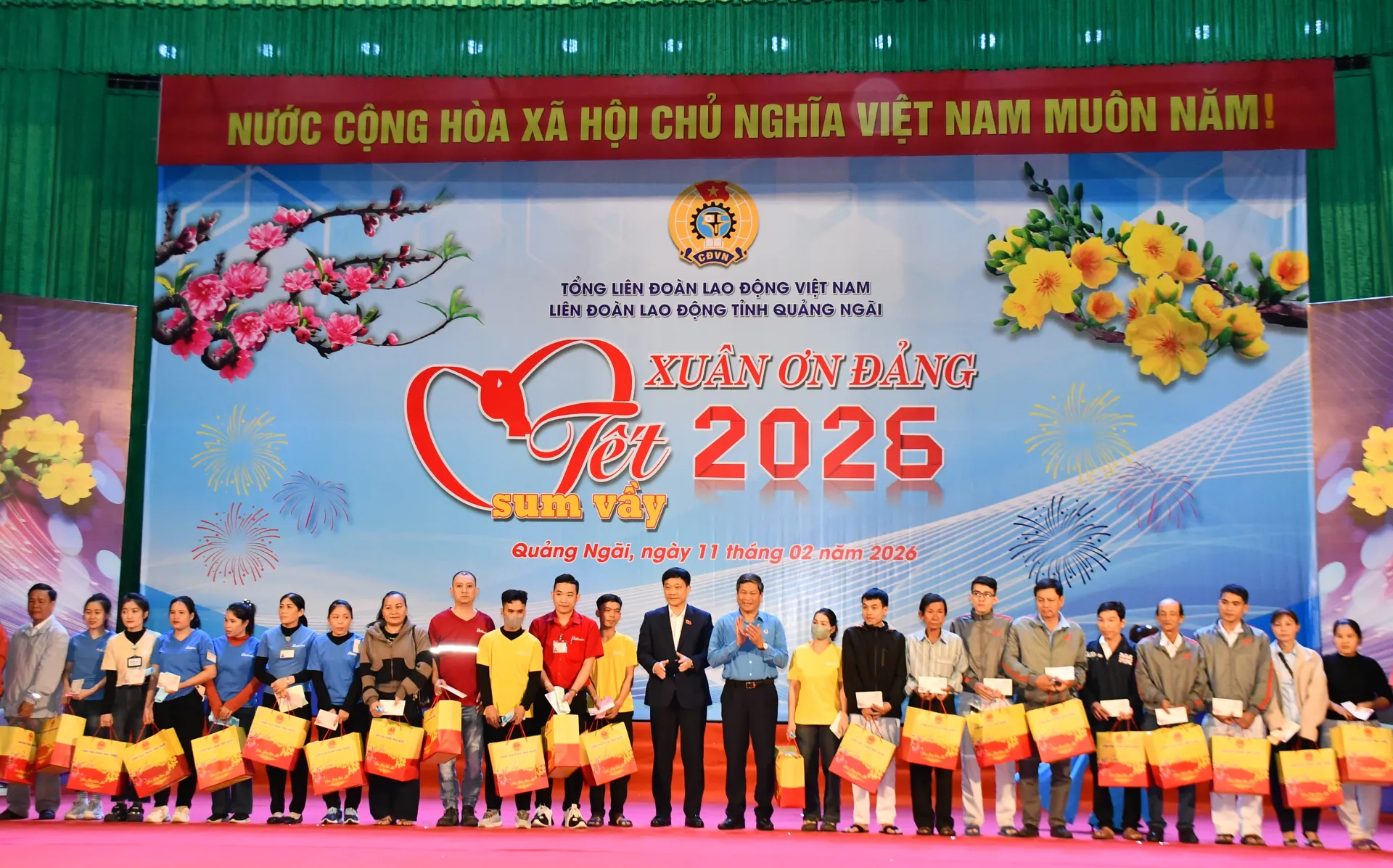 Theo Liên đoàn Lao động tỉnh Quảng Ngãi, trong dịp Tết Sum vầy – Xuân ơn Đảng năm 2026, lãnh đạo Đảng, Nhà nước, Ủy ban Trung ương MTTQ Việt Nam, các Ủy ban của Quốc hội, Tổng Liên đoàn Lao động Việt Nam, lãnh đạo tỉnh và Liên đoàn Lao động tỉnh đã dành tặng trên 7.000 suất quà, với tổng kinh phí trên 7,3 tỷ đồng cho các gia đình chính sách, đoàn viên, công nhân, người lao động.