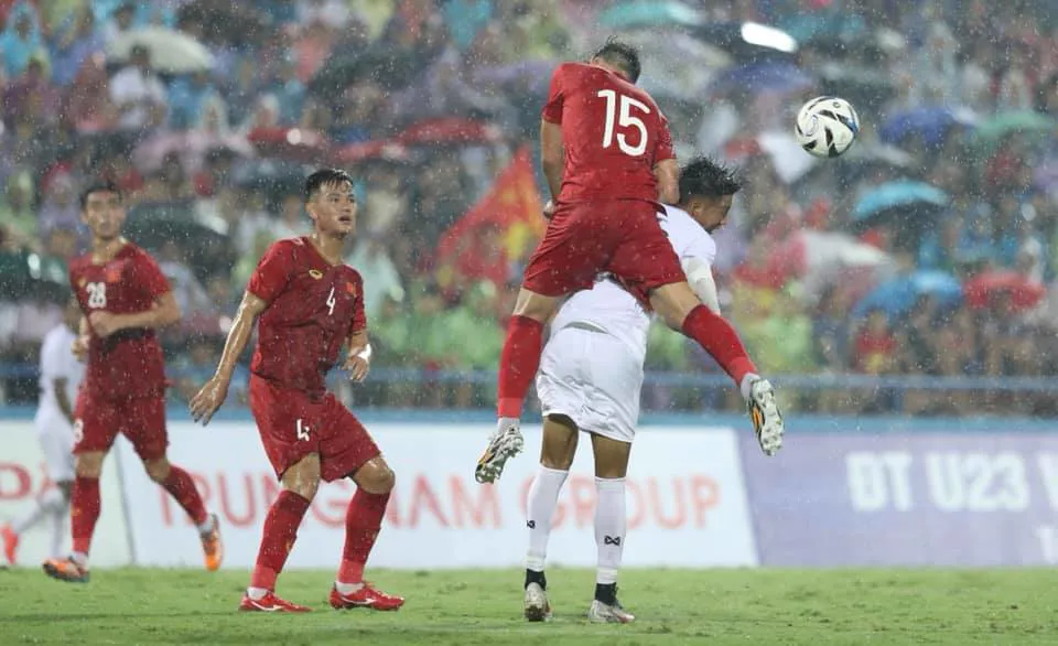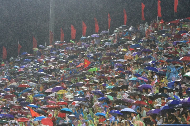 Dù trời mưa to nhưng trên các khán đài, hàng vạn CĐV đội mưa vẫn cổ vũ nhiệt tình cho các cầu thủ U23 Việt Nam.