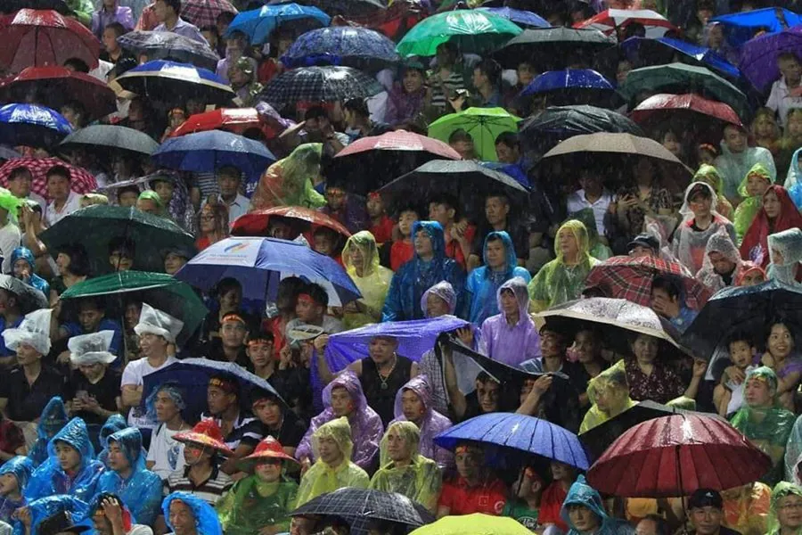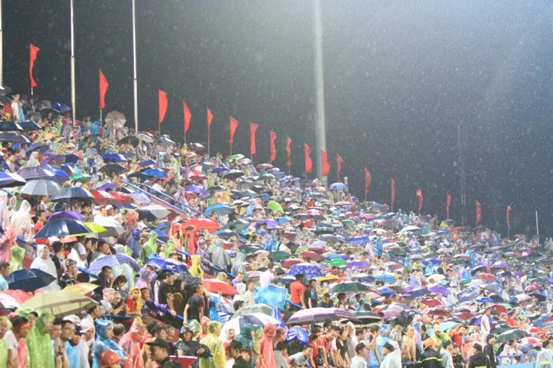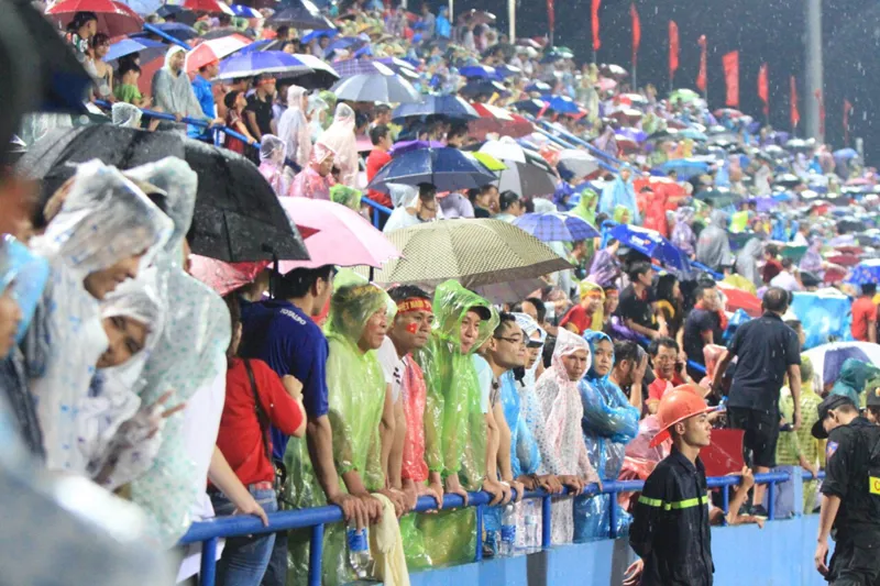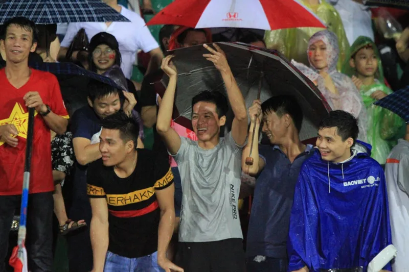 | CĐV đội mưa cổ vũ nhiệt tình dưới mưa cho các cầu thủ U23 Việt Nam. |