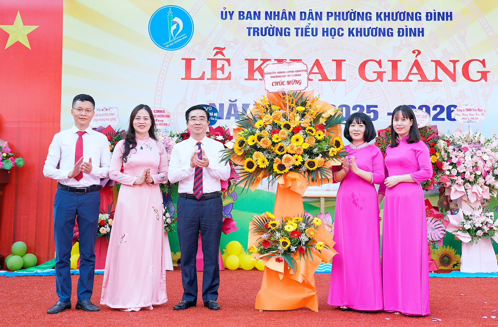 Bí thư Đảng ủy, Chủ tịch HĐND phường Khương Đình Võ Đăng Dũng tặng hoa chúc mừng cán bộ, giáo viên, nhân viên và học sinh Trường Tiểu học Khương Đình