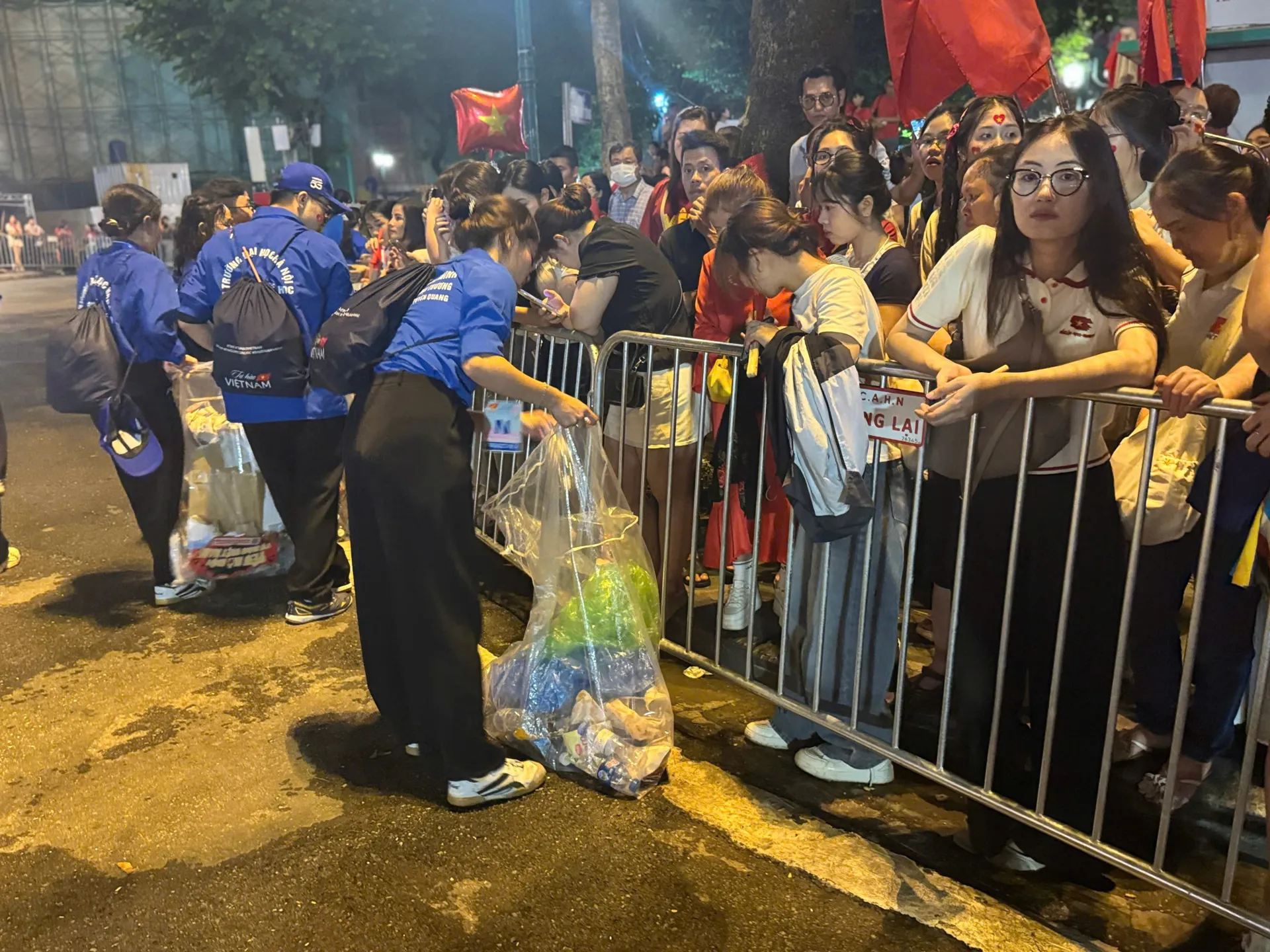 Khắp các tuyến đường tập trung đông người dân xem diễu binh, diễu hành đều có màu áo xanh của thanh niên tình nguyện hỗ trợ nhặt rác, gom vào nơi quy định