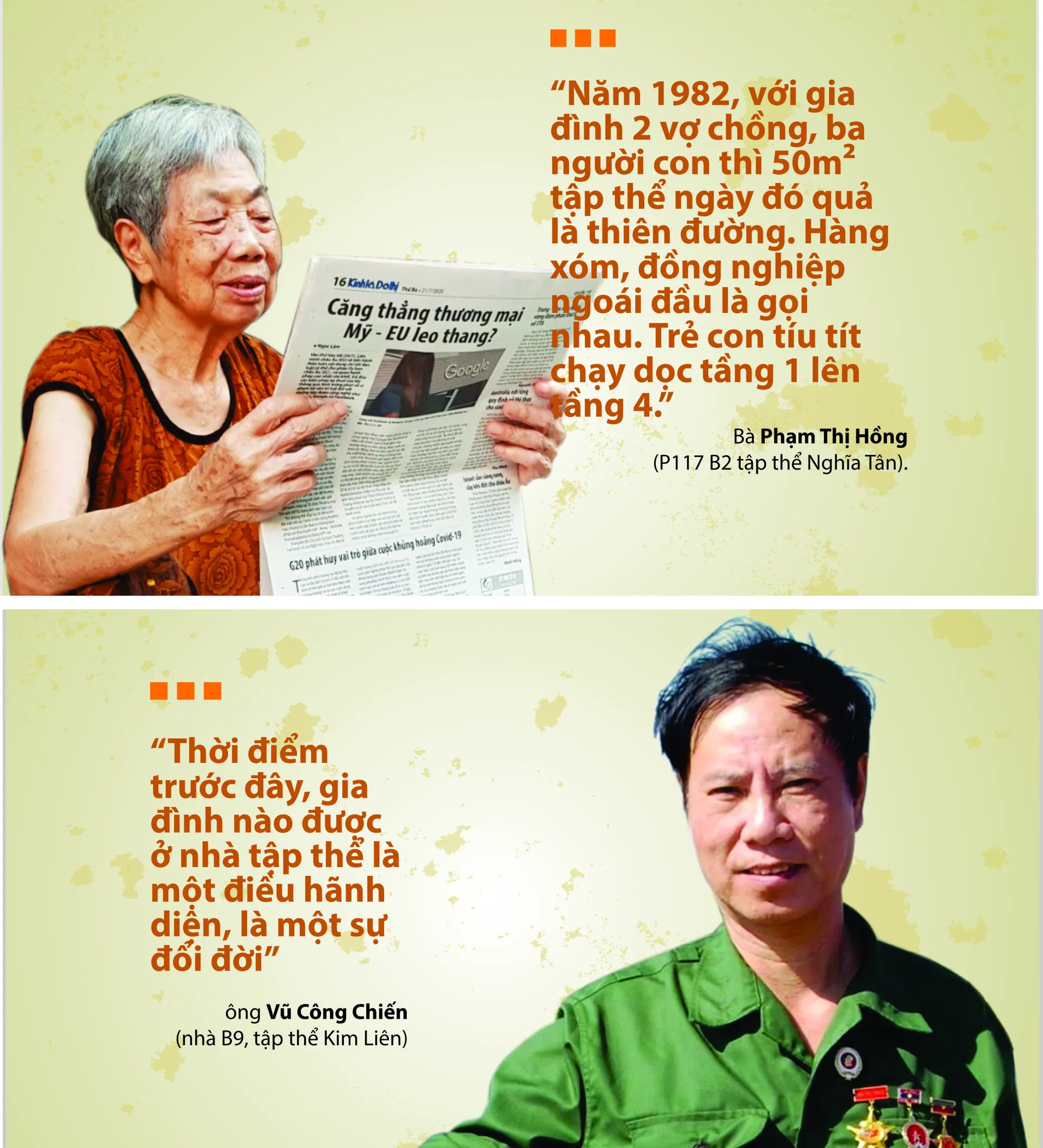 Theo lời kể của ông Vũ Công Chiến, nhà tập thể thời những năm 60 của thế kỷ trước được xem là nơi ở cao cấp. Mỗi cầu thang đi lên sẽ có 2 cửa ra vào, tương ứng với 4 gia đình sinh sống. Diện tích mỗi căn khoảng 40m2, lớn hơn gấp đôi, thậm chí gấp 3 so với nơi ở cũ. Hai gia đình sẽ sử dụng chung nhà bếp, nhà tắm, vệ sinh. Đặc biệt, nhà ở có sẵn nước sạch nên việc sinh hoạt đảm bảo vệ sinh hơn nhiều so với nhà ở cũ. “Có thể nói, thời điểm trước đây, gia đình nào được ở nhà tập thể là một điều hãnh diện, là một sự đổi đời” – ông Vũ Công Chiến chia sẻ.