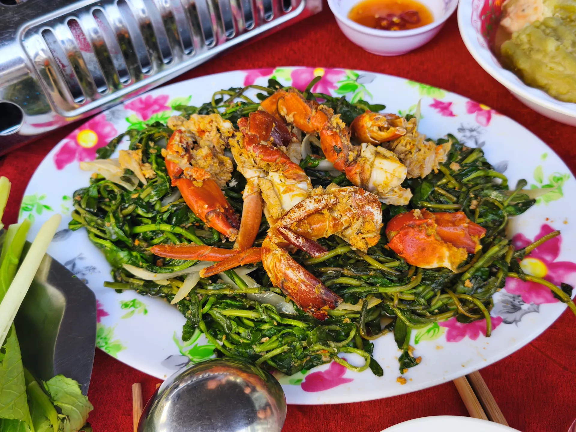 Cua gạch Cà Mau xào rau đắng đất trên bàn tiệc một hộ dân ở phường Láng Tròn, tỉnh Cà Mau. Ảnh Hoàng Nam