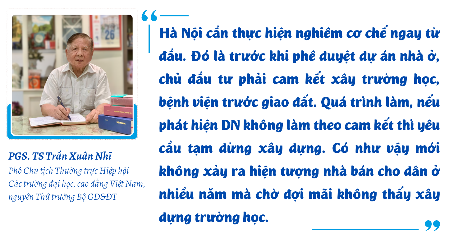 “Chúng ta thiếu điều tra, giám sát cụ thể về việc khu đô thị có đất nhưng không xây trường học, thậm chí không giải phóng mặt bằng. Việc này phải có chế tài và phân cấp phân quyền để giám sát, thanh tra, xử lý”, Phó Chủ tịch Hội Quy hoạch phát triển đô thị Việt Nam nói.