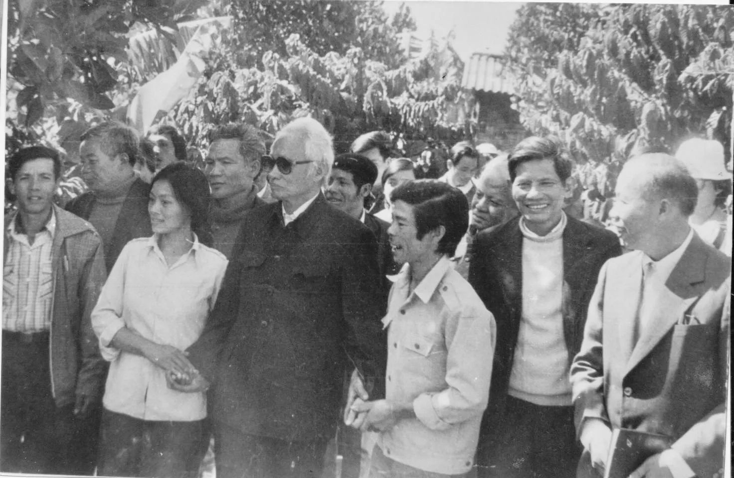 Thủ tướng Phạm Văn Đồng (ở giữa đeo kính) thăm gia đình ông bà Trần Văn Mùi, bà Trần Thị Hải thuộc Hợp tác xã Thanh Trì - vùng kinh tế mới Hà Nội tại Lâm Đồng. Ảnh tư liệu