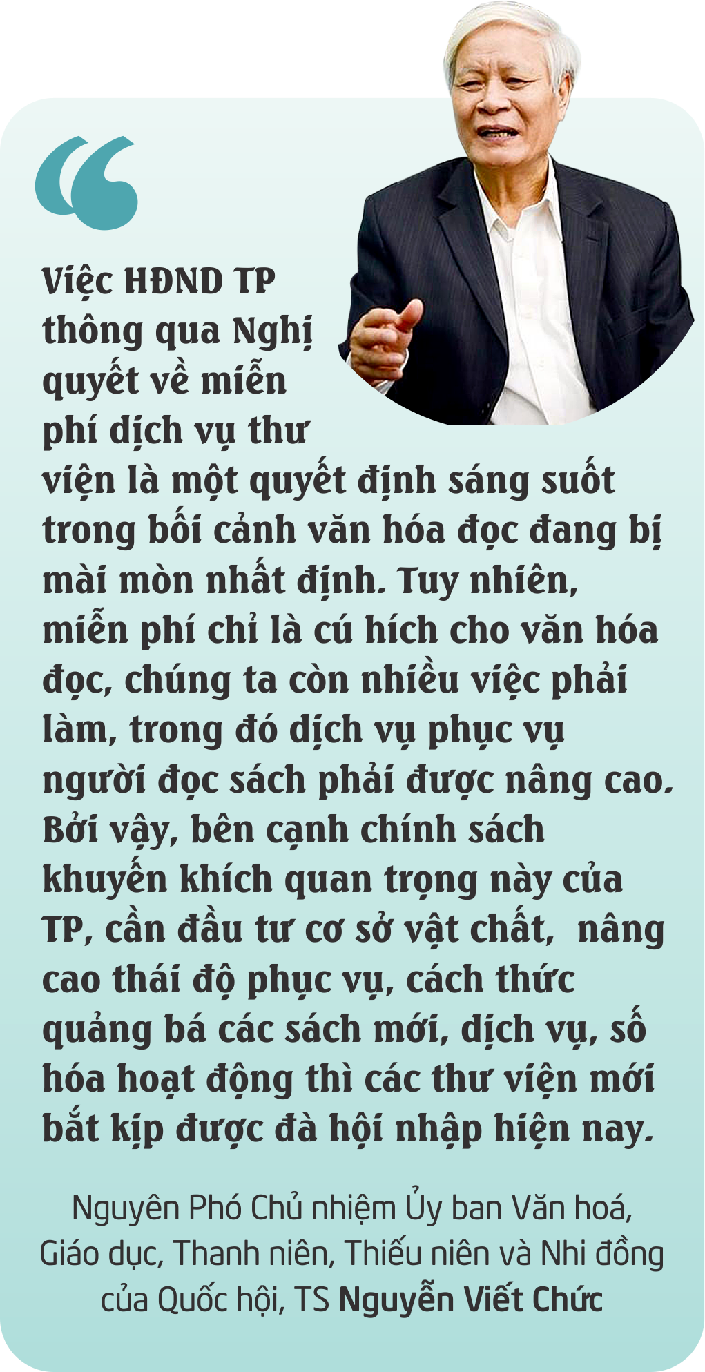 Việc HĐND TP Hà Nội mới đây đã thông qua Nghị quyết về miễn phí sử dụng tài nguyên thông tin tại thư viện, mượn theo thời hạn quy định trong nội quy thư viện… được đánh giá là một quyết định rất kịp thời và ý nghĩa nhằm thu hút người dân đến với các thư viện. Tuy nhiên, để thư viện ngày càng hấp dẫn người đọc, cần có sự quan tâm đầu tư cho hệ thống thư viện từ hạ tầng đến đầu sách, cũng như nâng cao chất lượng dịch vụ phục vụ độc giả.