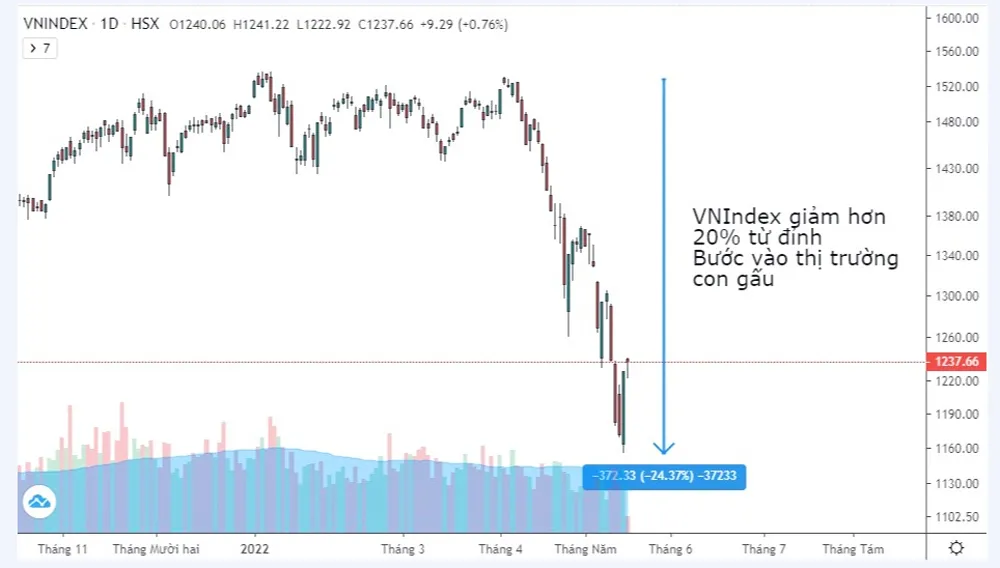 Theo chuyên gia của Công ty Cổ phần Chứng khoán SSI (SSI) nhận định: TTCK đã rơi vào trạng thái thị trường con gấu. Theo đó, thị trường con gấu là thị trường trải qua sụt giảm kéo dài, xảy ra khi thị trường chung giảm hơn 20% so với mức đỉnh trước đó trong bối cảnh tâm lý NĐT bi quan và tiêu cực lan rộng. Trong thị trường con gấu, cổ phiếu giảm trung bình 36%.