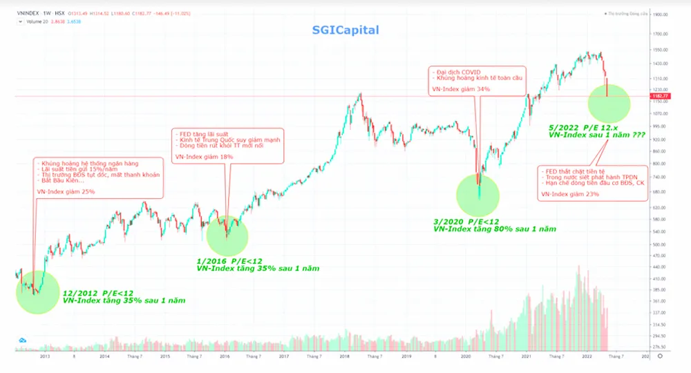 Theo thống kê từ SGI Capital, trong 10 năm qua, thị trường chứng khoán Việt Nam đã có 3 lần sụt giảm mạnh đưa định giá P/E về mức rất rẻ. Cụ thể, lần 1 vào cuối năm 2012: Với tâm điểm là cuộc khủng hoảng hệ thống Ngân hàng, nợ xấu lên tới 17%, lãi suất tiền gửi tăng lên 14%/năm, thị trường bất động sản giảm mạnh và mất thanh khoản. Doanh nghiệp của hầu hết mọi ngành nghề chịu ảnh hưởng nghiêm trọng. Chỉ số VN-Index giảm 25%.