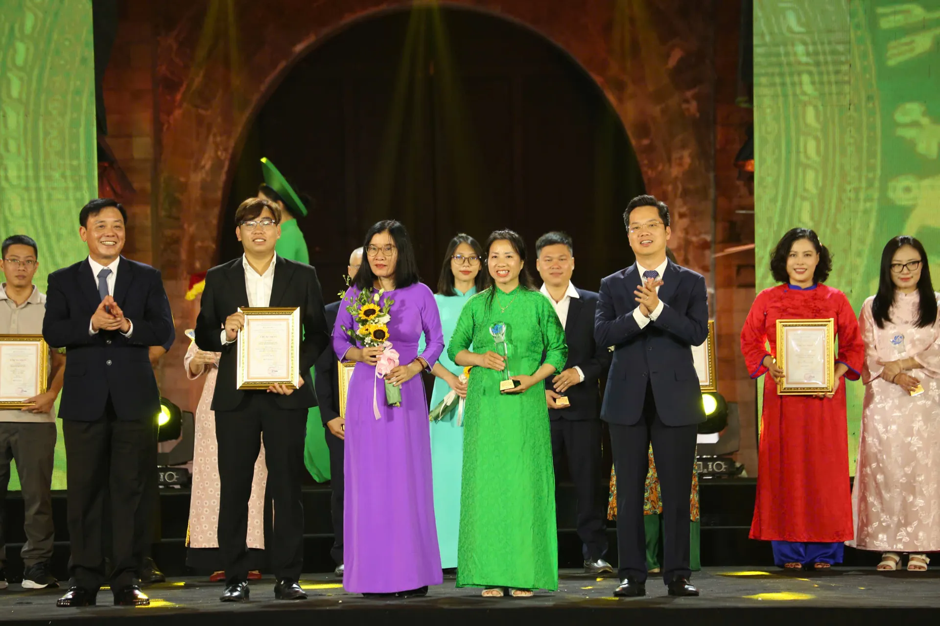 Thứ trưởng Bộ VHTT&DL Trịnh Thị Thủy và Thứ trưởng Bộ Ngoại giao Lê Thị Thu Hằng trao giải B có các tác giả, nhóm tác giả.
