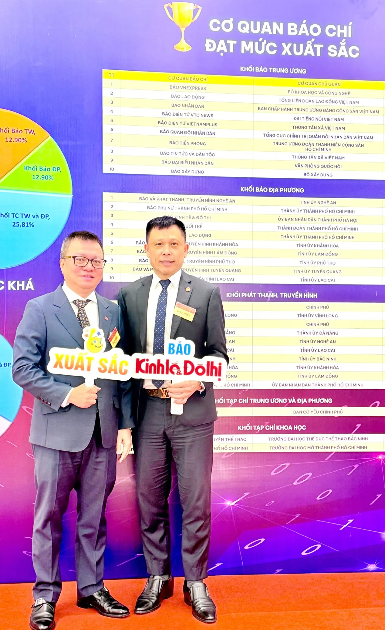 Tổng Biên tập Báo Kinh tế & Đô thị Nguyễn Thành Lợi chụp ảnh cùng ông Lê Quốc Minh - Ủy viên Trung ương Đảng, Phó Trưởng ban Tuyên giáo và Dân vận Trung ương, Tổng biên tập báo Nhân dân, Chủ tịch Hội Nhà báo Việt Nam tại Bức tranh Chuyển đổi số báo chí 2025.