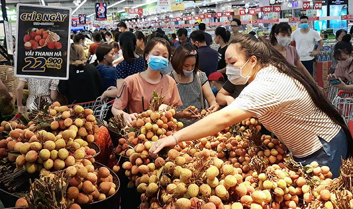 | Người tiêu dùng mua vải thiều Thanh Hà tại siêu thị Big C. Ảnh Lê Nam |