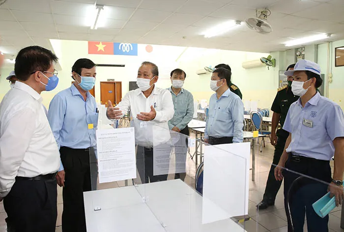 | Phó Thủ tướng Thường trực Chính phủ Trương Hòa Bình kiểm tra công tác phòng chống Covid-19 tại Công ty Mtex, TP Hồ Chí Minh. Ảnh Mạnh Hùng |