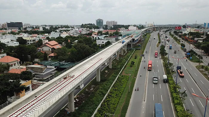 | Tuyến metro số 1 từ Thủ Đức nhìn về hướng trung tâm TP Hồ Chí Minh. Bên cạnh là xa lộ Hà Nội thường gặp tình trạng ùn tắc giao thông |