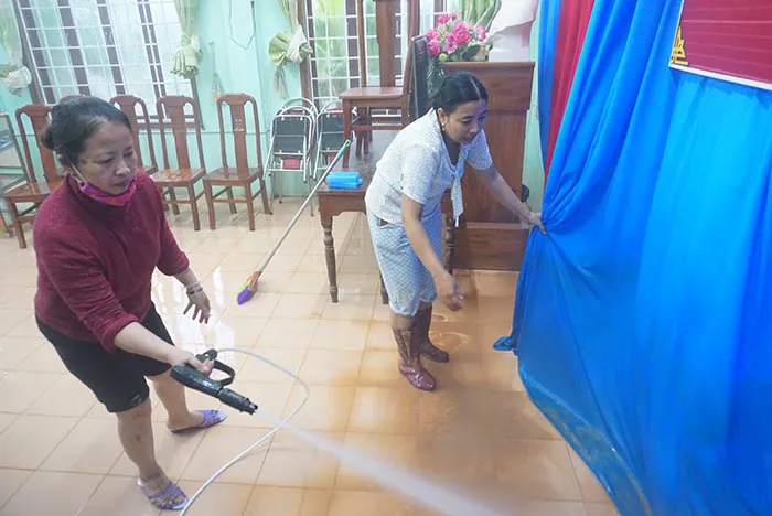 | Các cô giáo trường Mầm non xã Triệu Độ, huyện Triệu Phong, tỉnh Quảng Trị dọn dẹp vệ sinh trường lớp để sớm đón học sinh trở lại. Ảnh: Quang Hải |