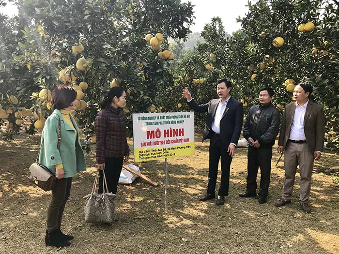 | Đoàn cán bộ Sở NN&PTNT Hà Nội đánh giá năng suất, chất lượng mô hình bưởi tại xã Nam Phương Tiến, huyện Chương Mỹ. Ảnh: Ngọc Ánh |