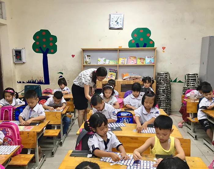 | Học sinh lớp 1 trường Tiểu học Tam Hưng, huyện Thanh Oai trong giờ học. Ảnh: Trần Oanh |