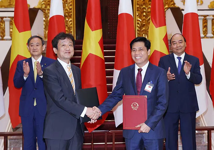 | Thủ tướng Nguyễn Xuân Phúc và Thủ tướng Nhật Bản Suga Yoshihide chứng kiến Lễ trao Bản ghi nhớ giữa Bộ GTVT Việt Nam và Bộ Đất đai Nhật Bản. Ảnh: Thống Nhất |