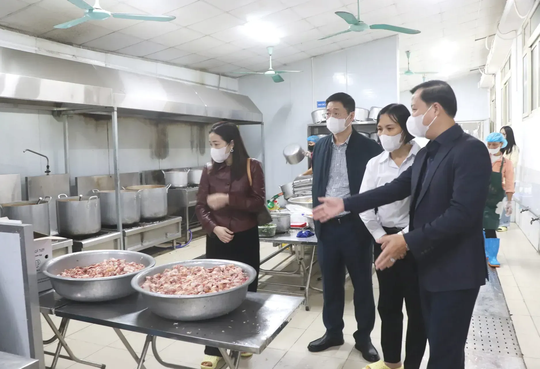 Đoàn liên ngành của TP kiểm tra đột xuất bếp ăn tập thể Trường Tiểu học Cự Khê (xã Bình Minh).