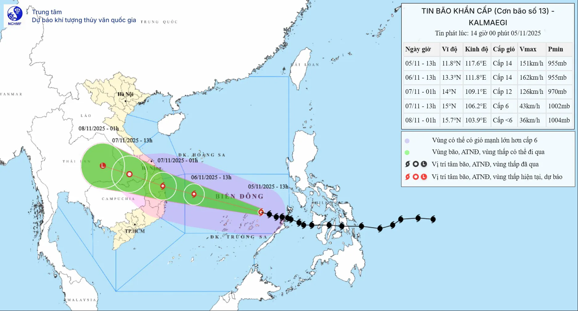 Bản đồ dự báo quỹ đạo và cường độ bão số 13 (Kalmaegi) phát lúc 14 giờ 00 ngày 05/11/2025. Ảnh: KTTV