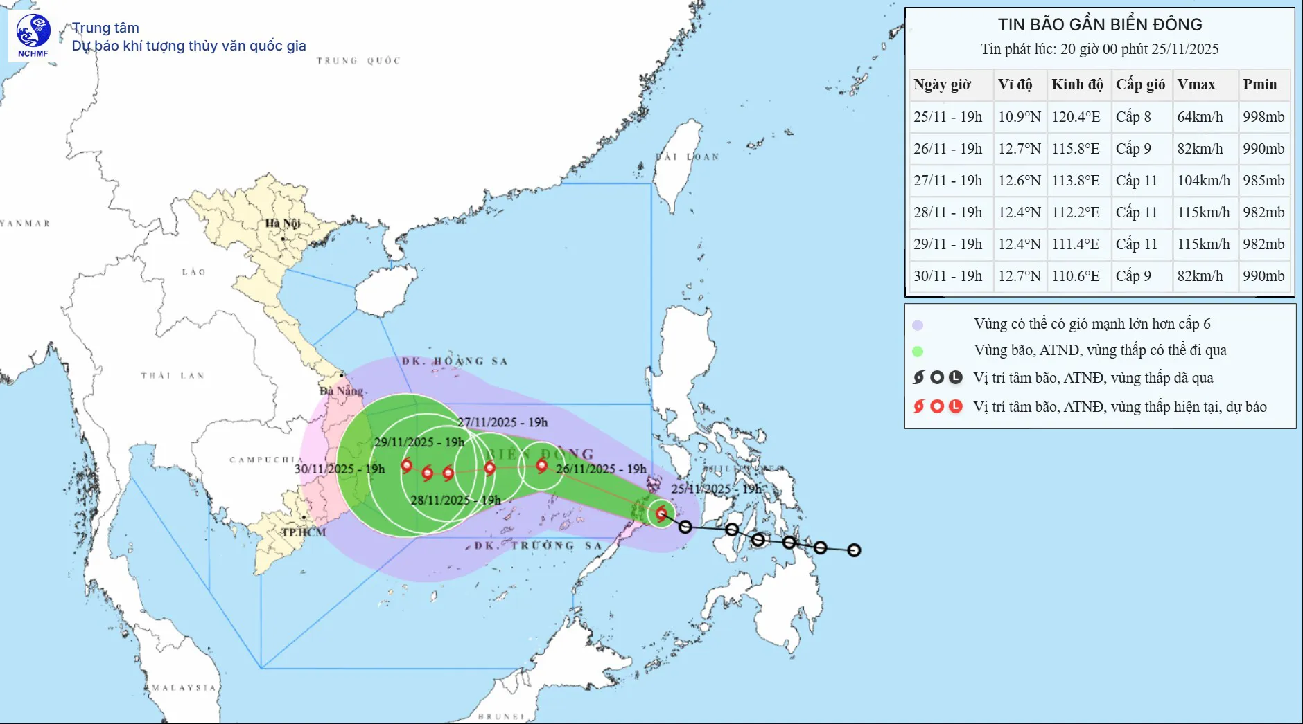 Theo Trung tâm Dự báo khí tượng thuỷ văn quốc gia, tối 25/11, áp thấp nhiệt đới trên vùng biển phía Tây của miền Trung Philippines đã mạnh lên thành bão. Sức gió mạnh nhất vùng gần tâm bão mạnh cấp 8, giật cấp 10.