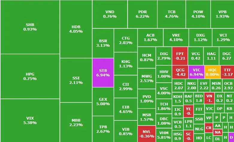 Động lực chính dẫn dắt đà bứt phá của thị trường đến từ sự đồng thuận hiếm thấy giữa hai nhóm ngành có vốn hóa lớn nhất là ngân hàng và bất động sản, đặc biệt là nhóm cổ phiếu liên quan đến Vingroup. Trong nhóm ngân hàng, STB trở thành tâm điểm khi tăng kịch trần 6,94% lên 52.400 đồng/cổ phiếu và rơi vào trạng thái trắng bên bán. Hàng loạt cổ phiếu ngân hàng khác cũng tăng mạnh như TCB tăng gần 4,7%, HDB tăng hơn 4%, MBB tăng trên 2%, CTG tăng hơn 2%, góp phần củng cố niềm tin cho dòng tiền lớn quay trở lại thị trường.