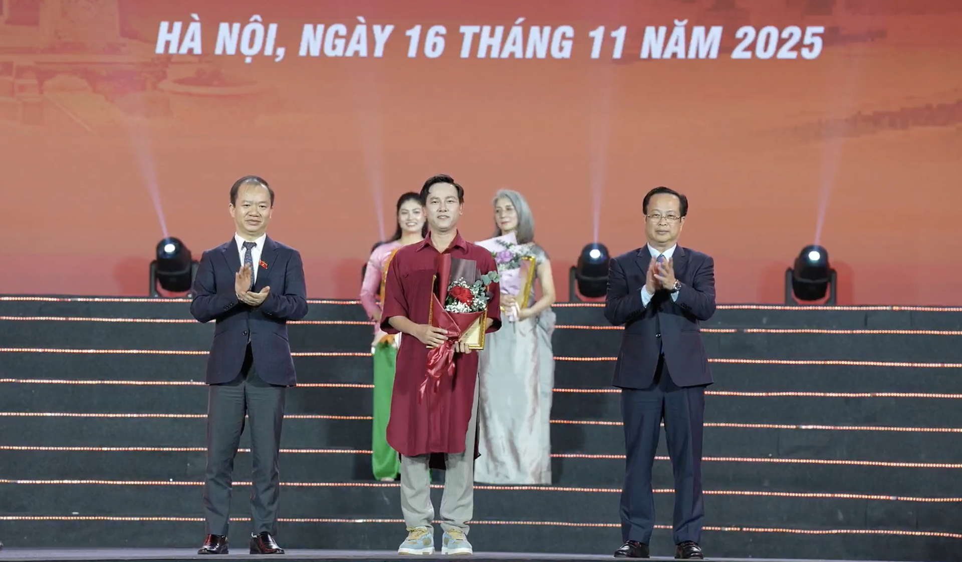 Ủy viên Ban Thường vụ Thành ủy, Phó Chủ tịch HĐND TP Hà Nội Trần Thế Cương và PGS.TS Bùi Hoài Sơn - Ủy viên chuyên trách Ủy ban Văn hóa và Xã hội của Quốc hội trao chứng nhận và hoa cho các cá nhân, tập thể có cống hiến nổi bật tại Festival Thăng Long - Hà Nội năm 2025.
