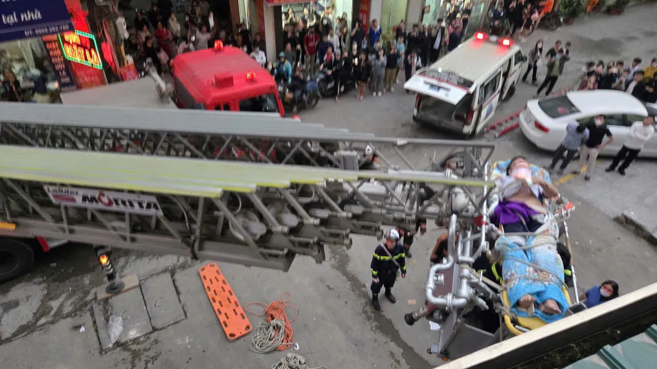 Lực lượng cảnh sát triển khai thang chuyên dụng cùng cán bộ chiến sĩ cứu nạn, cứu hộ đưa nạn nhân đi cấp cứu.