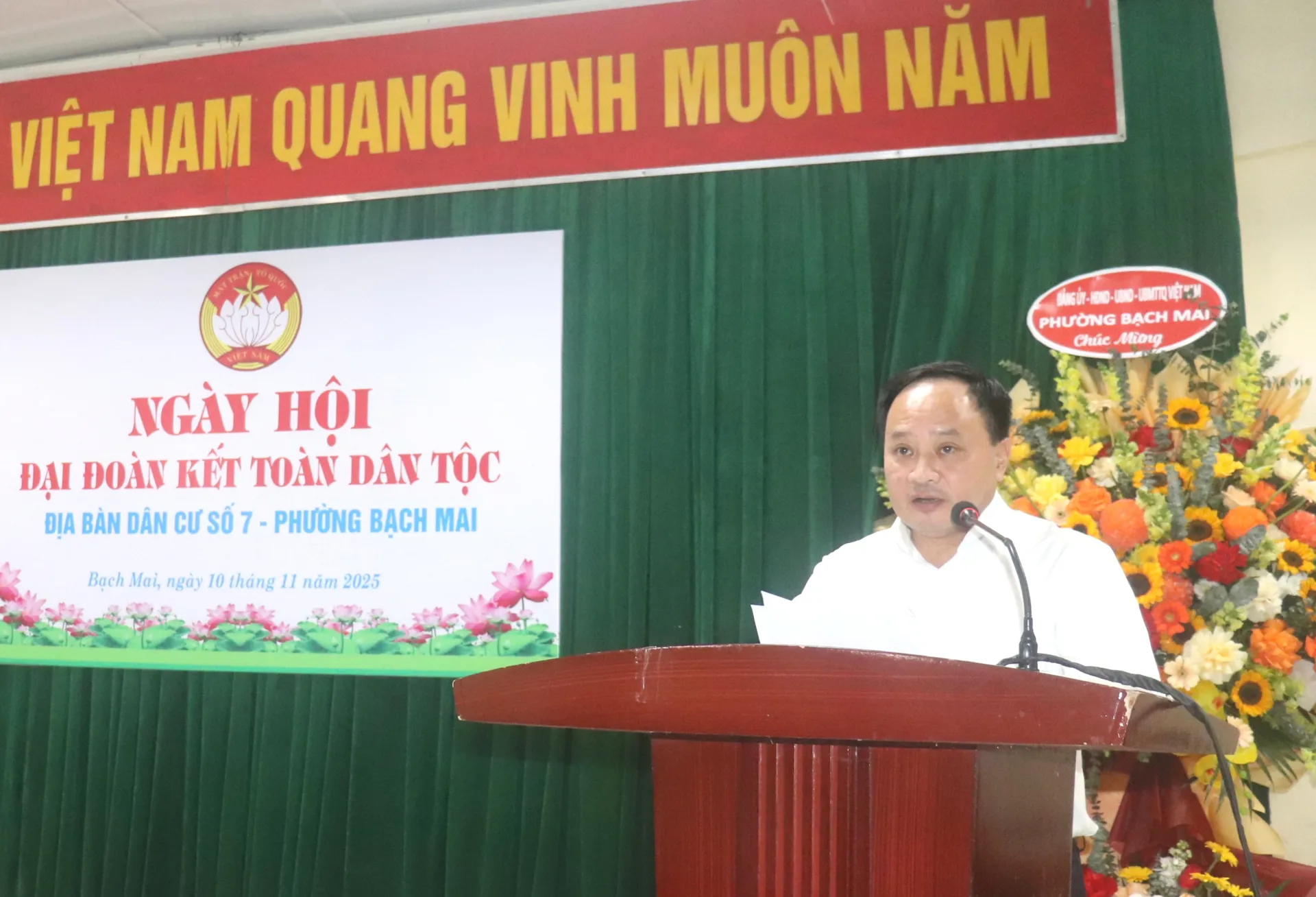 Thay mặt lãnh đạo phường phát biểu tại Ngày hội, Bí thư Đảng ủy, Chủ tịch HĐND phường Bạch Mai Trần Quyết Thắng biểu dương kết quả đạt được năm 2025 của địa bàn trong thực hiện Cuộc vận động “Toàn dân đoàn kết xây dựng nông thôn mới, đô thị văn minh”, góp phần xây dựng cộng đồng dân cư ngày một phát triển.