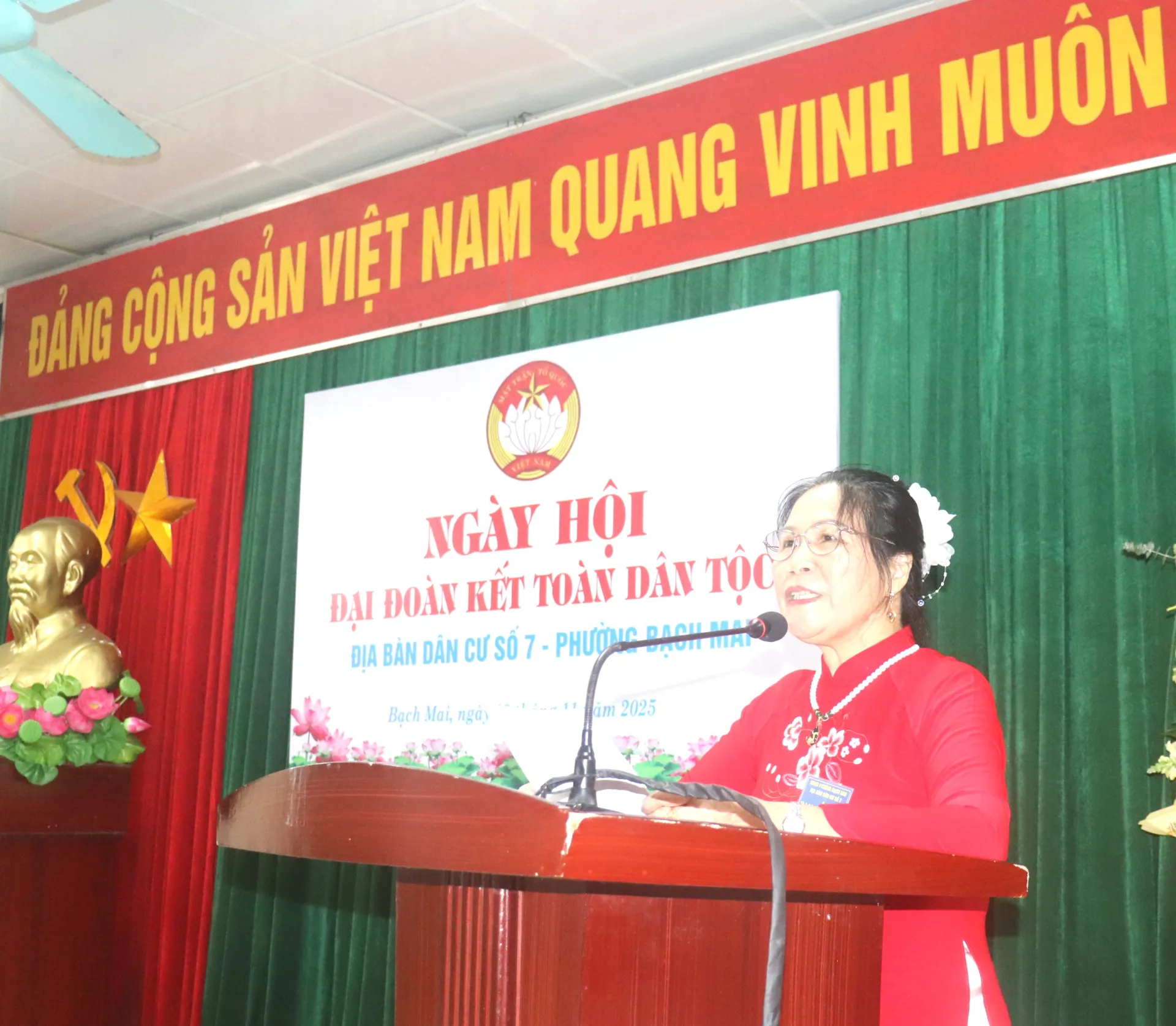 Đại diện Địa bàn dân cư số 7 phường Bạch Mai thông tin kết quả thực hiện phong trào thi đua yêu nước năm 2025 và diễn văn tuyên truyền kỷ niệm 95 năm Ngày truyền thống MTTQ Việt Nam
