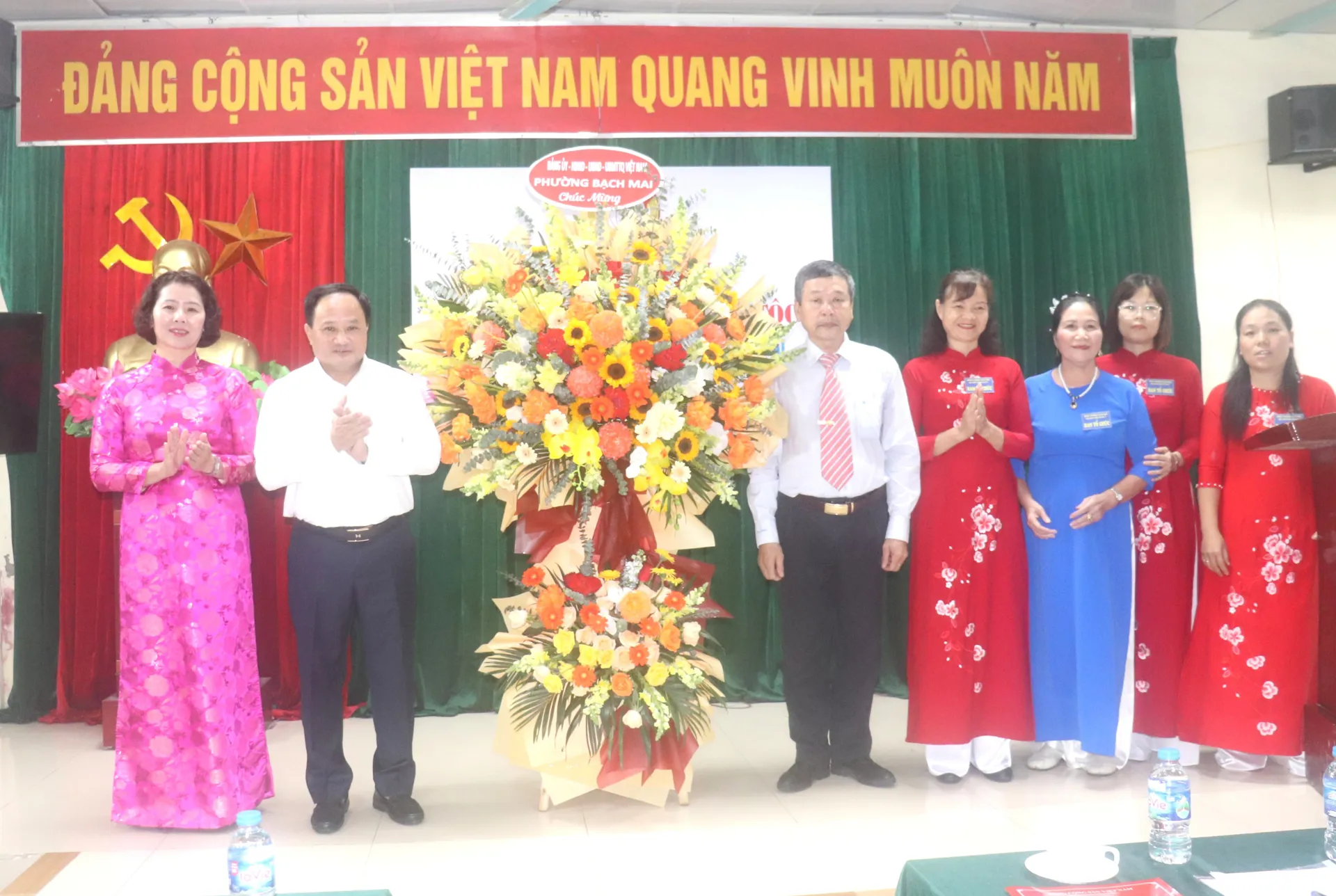 Bí thư Đảng ủy, Chủ tịch HĐND phường Bạch Mai Trần Quyết Thắng và Chủ tịch Ủy ban MTTQ Việt Nam phường Bạch Mai Tạ Thị Thanh Huyền tặng hoa của Đảng ủy, HĐND, UBND, UB MTTQ Việt Nam phường chúc mừng cán bộ, Nhân dân Địa bàn dân cư số 7