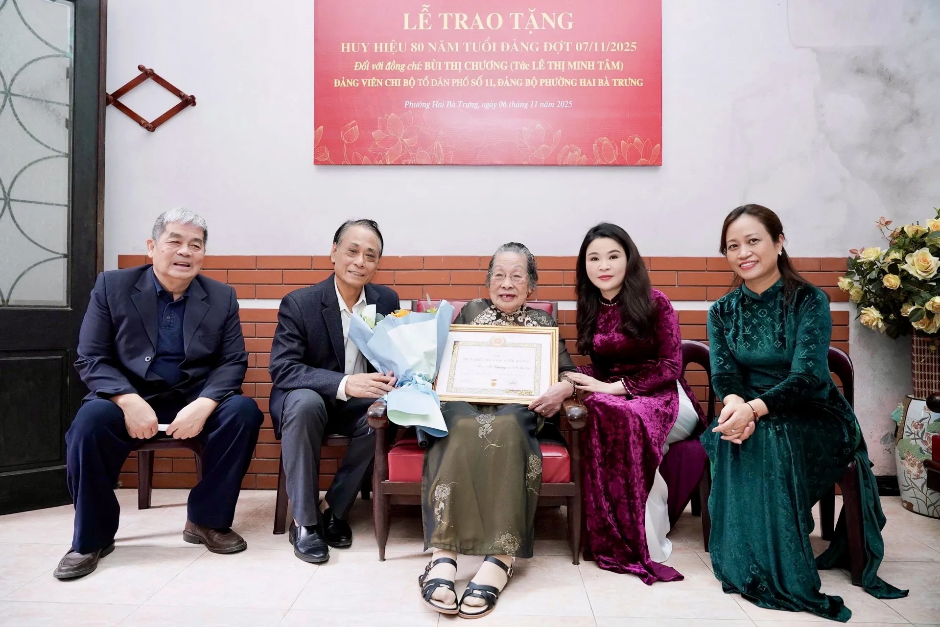 Hôm nay, 6/11, được sự ủy quyền của Thành ủy Hà Nội, đồng chí Chu Hồng Minh - Thành ủy viên, Bí thư Đảng ủy, Chủ tịch HĐND phường Hai Bà Trưng đã tới nhà riêng trân trọng trao Huy hiệu 80 năm tuổi Đảng tặng đồng chí Bùi Thị Chương (tức Lê Thị Minh Tâm) - Lão thành cách mạng, đảng viên sinh hoạt tại Chi bộ Tổ dân phố số 11, phường Hai Bà Trưng, TP Hà Nội.