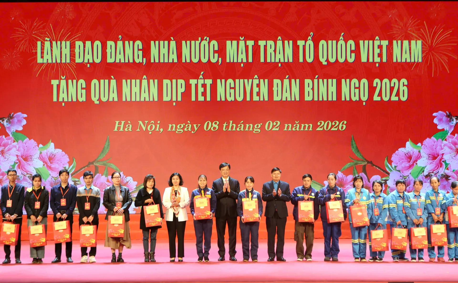 Bí thư Thành ủy Hà Nội Nguyễn Duy Ngọc, Chủ tịch Hội Liên hiệp Phụ nữ Việt Nam Nguyễn Thị Tuyến; Phó Chủ tịch Tổng LĐLĐ Việt Nam Phan Văn Anh trao quà tới công nhân, người lao động nhân dịp Tết Nguyên đán Bính Ngọ 2026