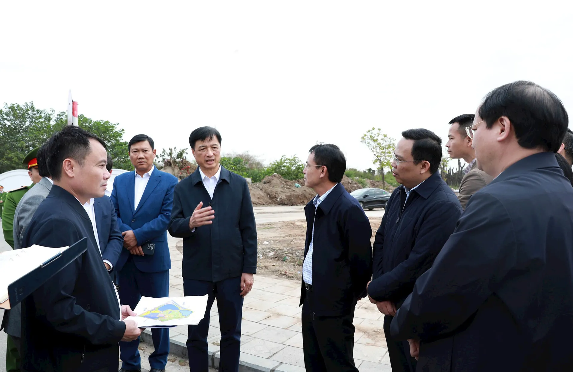 Bí thư Thành ủy Hà Nội Nguyễn Duy Ngọc và các đồng chí lãnh đạo thành phố nghe giới thiệu về hạ tầng, công tác xây dựng Công viên Chu Văn An.