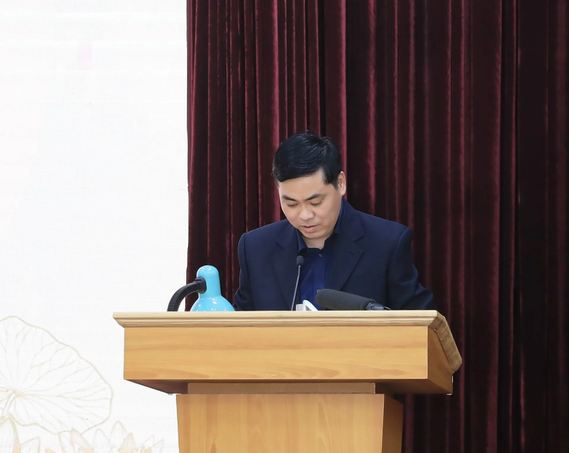 Đồng chí Nguyễn Đức Huấn - chuyên viên chính Văn phòng Đoàn đại biểu Quốc hội và HĐND thành phố Hà Nội trình bày chương trình hành động tại hội nghị. Ảnh: Quang Thái