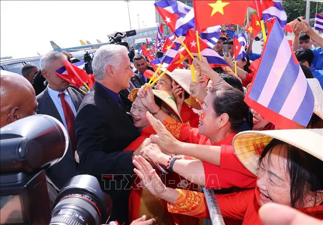 Đông đảo người dân Thủ đô Hà Nội đón Bí thư Thứ nhất, Chủ tịch nước Cuba Miguel Díaz-Canel Bermúdez và Phu nhân tại sân bay quốc tế Nội Bài. Ảnh: Văn Điệp/TTXVN