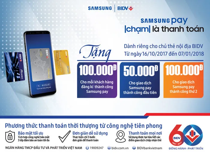 Đặc biệt hơn nữa, trong thời gian từ 16/10/2017 đến 7/1/2018, khách hàng đăng ký thành công và/hoặc thực hiện giao dịch bằng dịch vụ BIDV Samsung pay có cơ hội nhận được quà tặng lên tới 250.000 đồng. Sau 2 đợt trả thưởng, đã có tới hơn 400 triệu đồng tiền thưởng đến tay hơn 3.000 khách hàng may mắn và cơ hội vẫn còn rất nhiều dành cho các khách hàng kế tiếp.