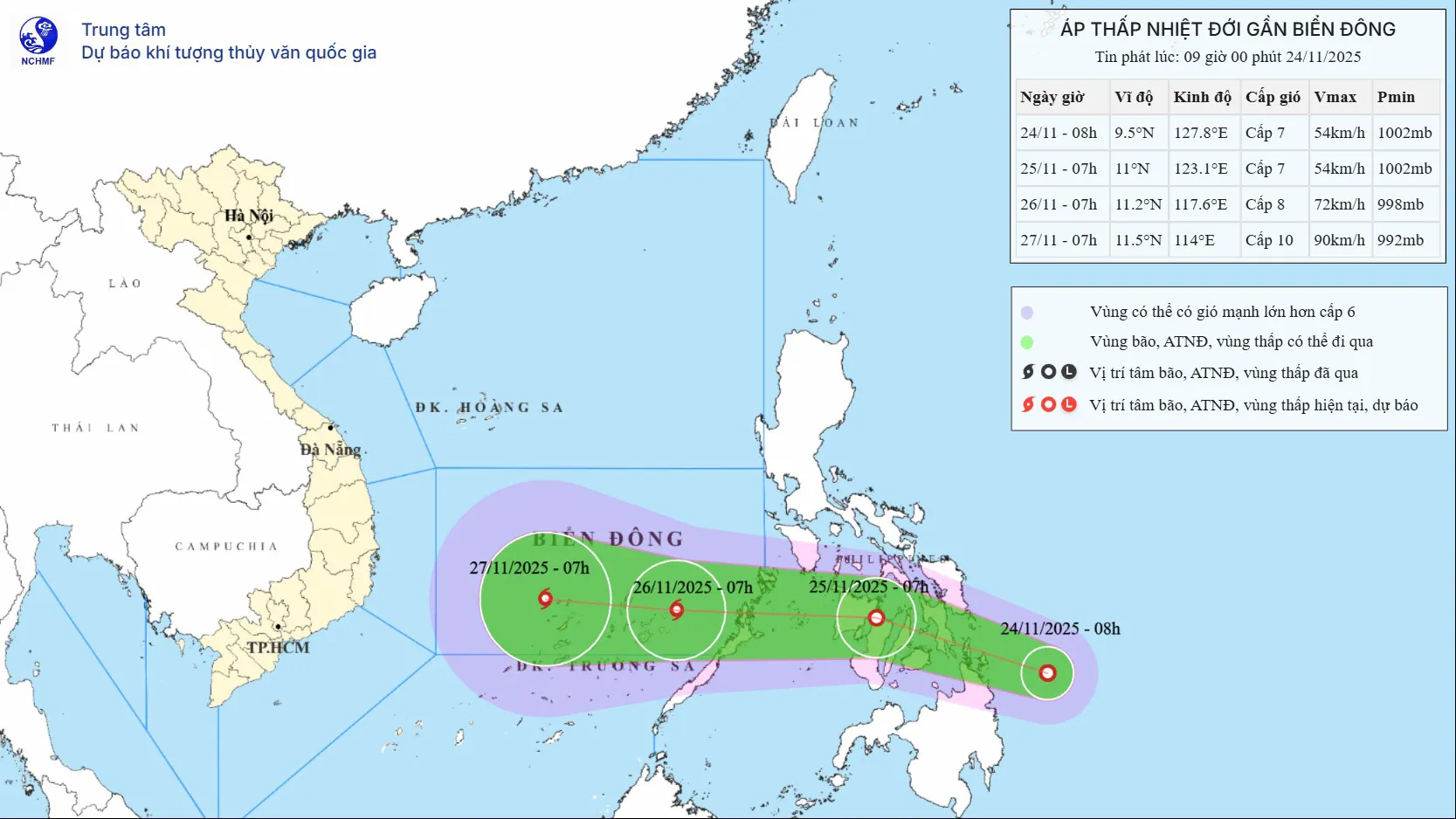 Dự kiến khoảng 7 giờ ngày 26/11, áp thấp nhiệt đới nằm trên vùng biển phía Đông Nam khu vực Giữa Biển Đông, có khả năng mạnh lên thành bão cấp 8, giật cấp 10.